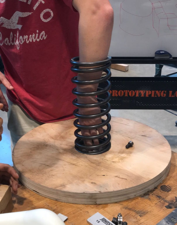 The base was built by laser cutting plywood and milling surfaces to create a steel weight insert that also connected with the rest of the product, the spring and baby seat. After production of the wooden base with steel insert, we used an interference fit with reinforcements to combine it to a custom made spring from McMaster-Carr that we nonetheless modified further by cutting and welding to ensure assembly.